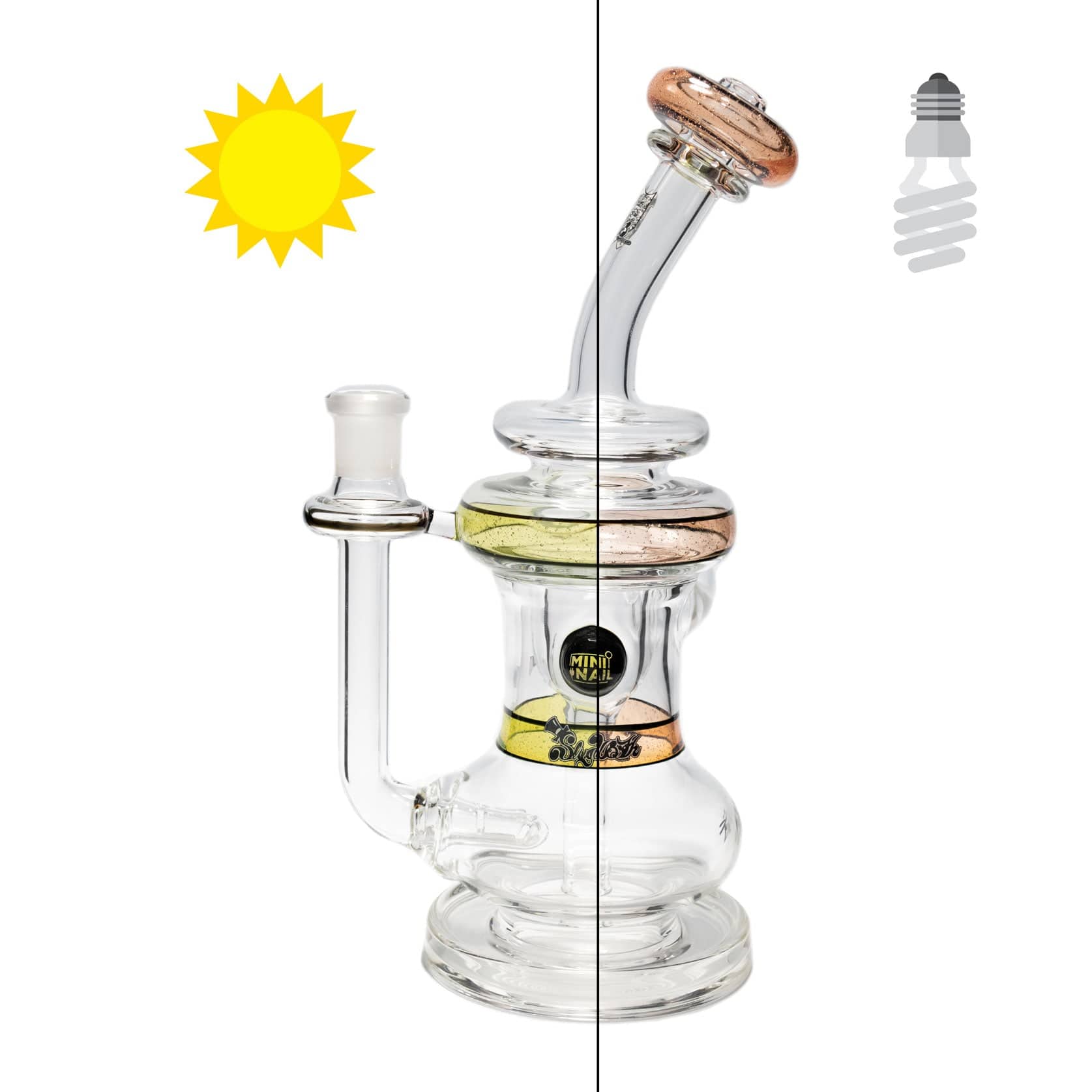 MiniNail™ x Slugworth Glass Incyclers are great for Enails. Slugworth is known for his amazing attention to detail & well made, highly functional glass rigs; made with thick boro glass and a very sturdy design. These Incyclers are built to have have amazing function and chug with no chance of "drinking" water from hitting it too hard. Each one contains encalmos (rings of color) and each side is lip wrapped with a thin line of raven black. All also contain a custom MiniNail™ Dichro Millie.